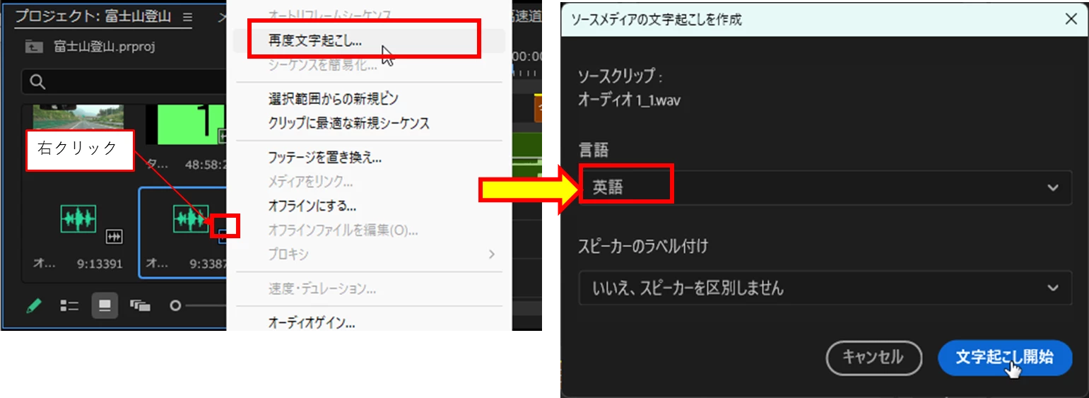 ③「プロジェクト」パネルで対象の文字起こし素材の上で右クリックし、開いたコンテキストメニューから「再度文字起こし」を選択します。次に開いた「ソースメディアの文字起こしを作成」ウィンドウで「英語」に設定し、「文字起こし開始」をクリックします。