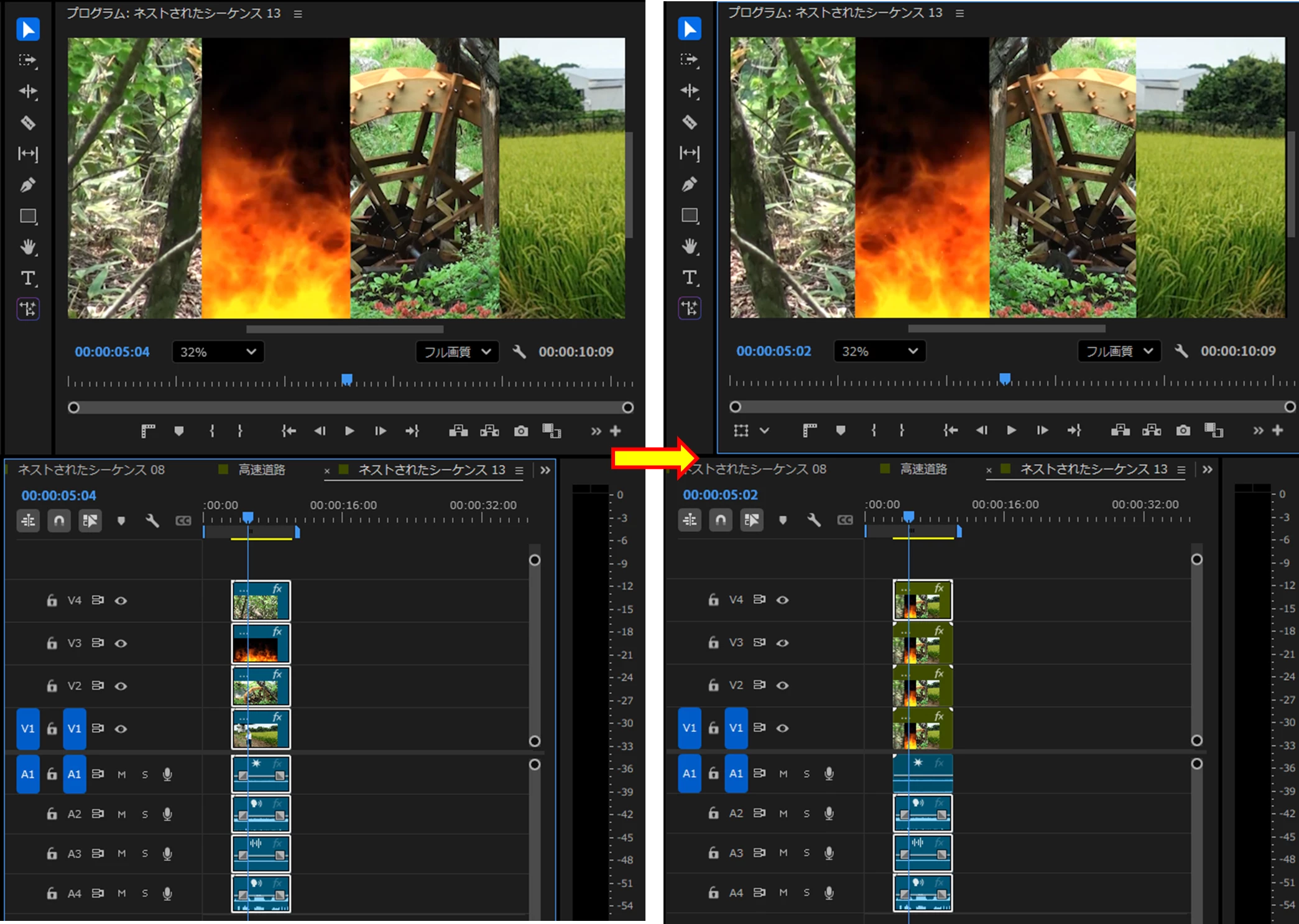 調整レイヤを含まない形でクリップをネストしたり、逆に調整レイヤーごとネストもしてみましたが、結果は同じでした。