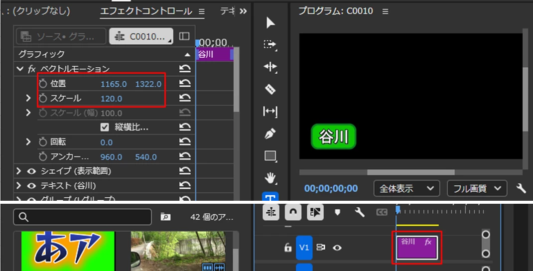 グラフィッククリップを選択し、「エフェクトコントロール」パネル⇒「グラフィック」⇒「ベクトルモーション」の「位置」と「スケール」で行います。