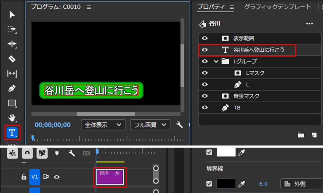 グラフィッククリップを選択し、「横書き文字ツール」を選択してから「プロパティ」パネルで「テキスト」レイヤーを選択して、赤い「テキスト入力ボックス」を表示させ、テロップの右端でクリックして赤い縦棒を表示させてからテキストを入力します。
