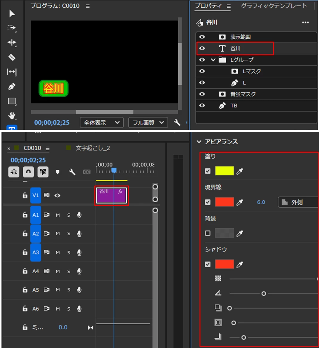 ④テロップの「塗り」、「境界線」と「シャドウ」の色を変更する方法。