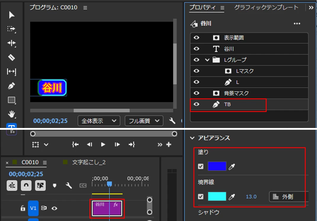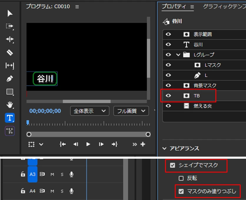 次に、「TB(テロップベース)」レイヤーを選択し、「アピアランス」項の「シェイプでマスク」と「マスクのみ塗りつぶし」にチェックを入れます。