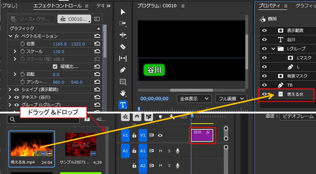 グラフィッククリップを選択し、挿入する画像ファイルや映像ファイルを「プロジェクト」パネルから「プロパティ」パネルの「TB(テロップベース)」レイヤーの下側へドラッグ&ドロップします。