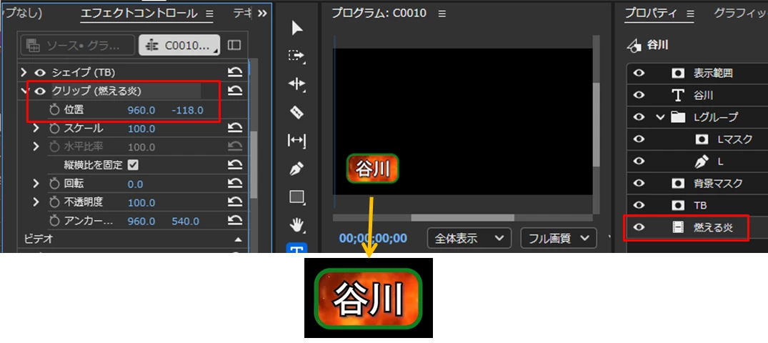 画像や映像が表示されない場合は、画像や映像レイヤーを選択し、「エフェクトコントロール」パネルで「クリップ(画像や映像名)」の「位置」で調整します。