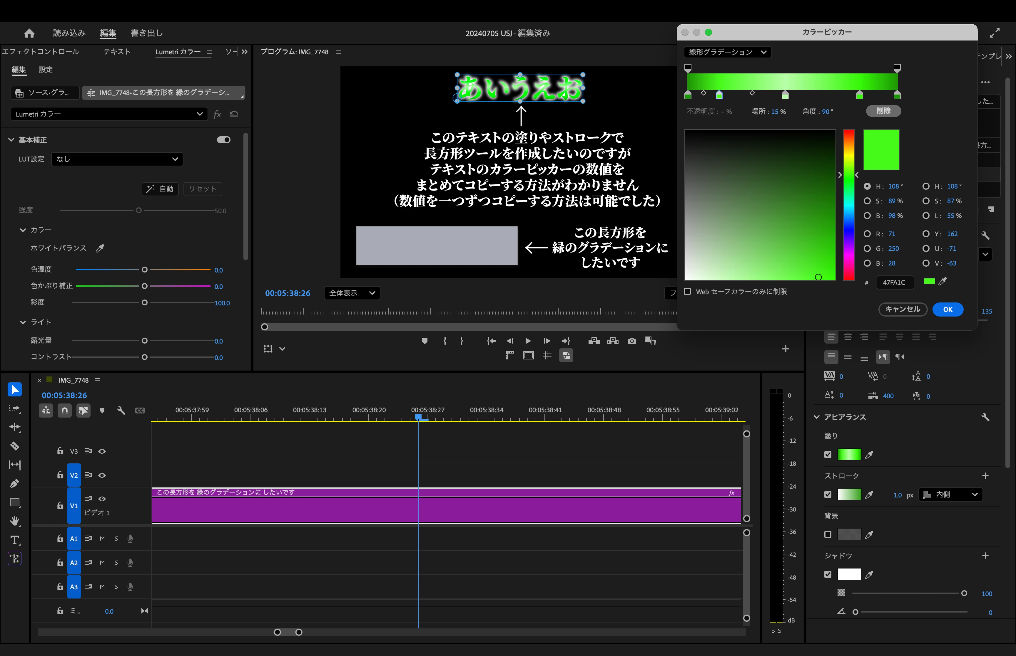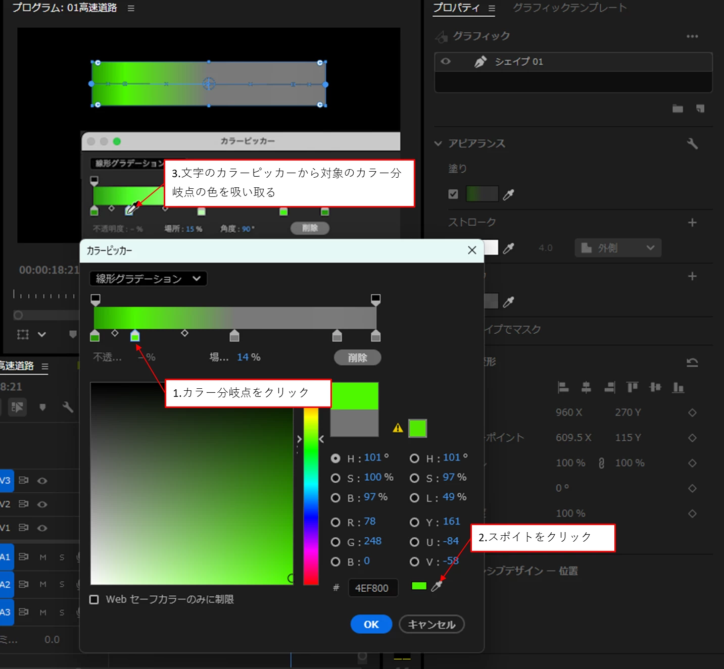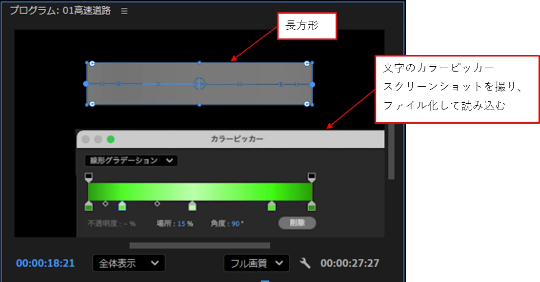 ①文字のカラーピッカーのスクリーンショットを撮り、ファイル化してPremiere Proに読み込み、長方形のクリップのトラックの下側に配置し位置とスケールを調整します。