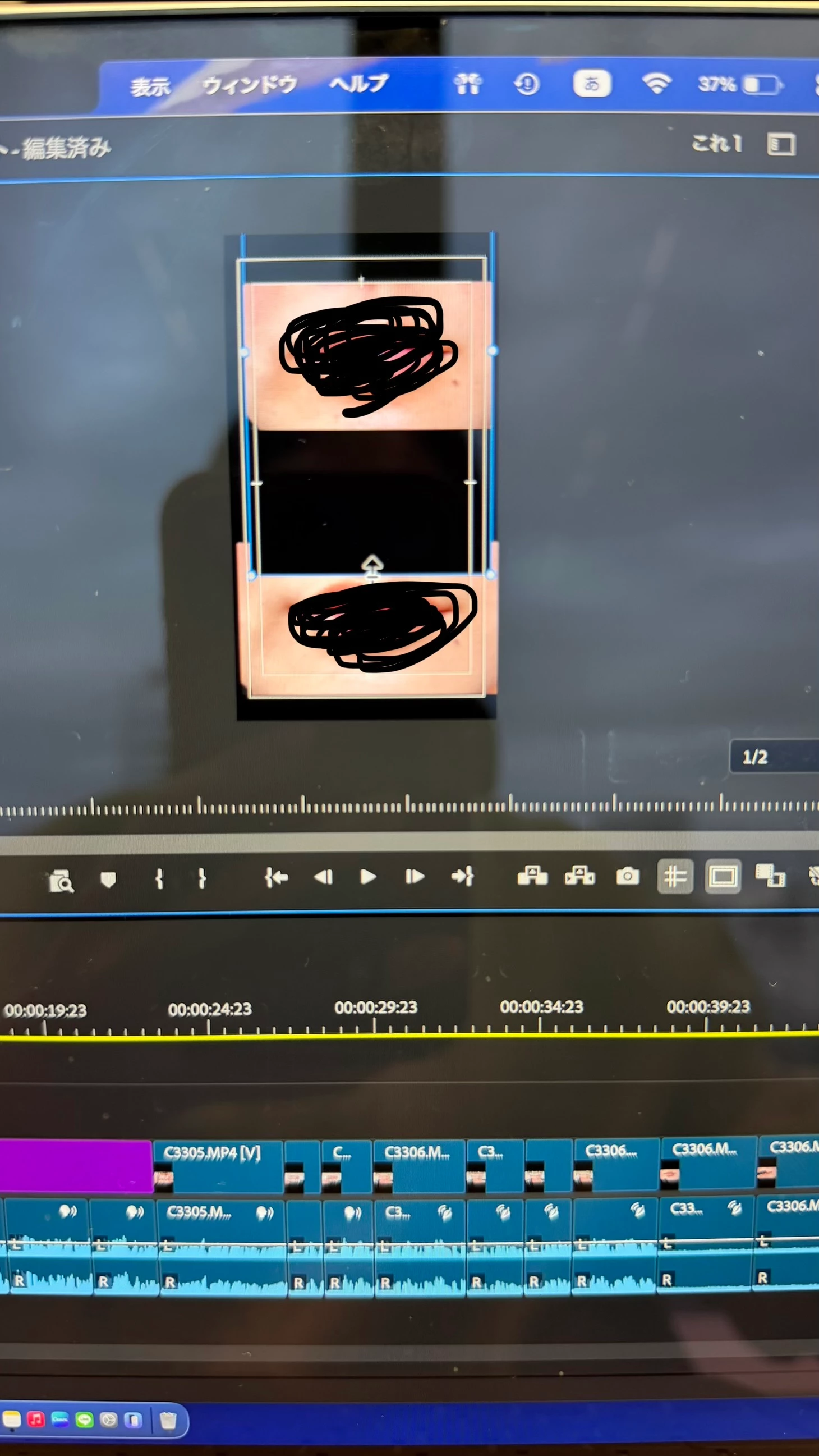 どなたか助けてください…。9:16のシーケンスの中に写真1枚目のように画像を上下2枚表示させたいのですが、なぜか別写真は写真(16:9)より大きい青枠(9:16 )になってしまい黒い余白でV2に差し込んでいる画像が消えてしまいます…。