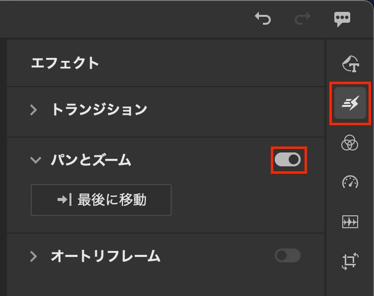 オフにする際は該当の画像(複数選択も可能です)を選択して、「エフェクト」メニューの「パンとズーム」のスイッチをオフにしていただくと効果が切れます。