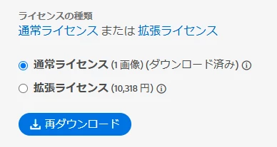 画像のダウンロードのページには通常ライセンスと拡張ライセンスと記載されていたのですが、購入済みライセンスのページで確認すると通常ライセンスのみとなっていました。