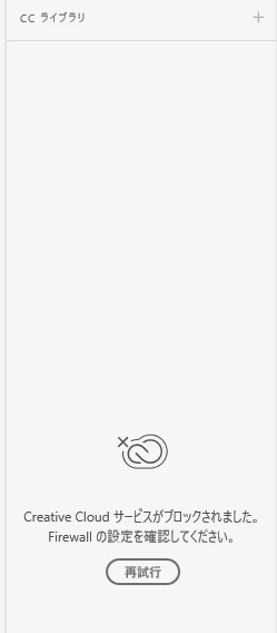 XDのCCライブラリパネルにて「Creative Cloudサービスがブロックされました。Firewallの設定を確認してください。」と表示。ライブラリが読み込まれない。