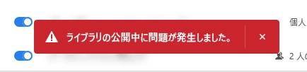 ライブラリの公開・更新を実行すると「ライブラリの公開中に問題が発生しました」「アップロードエラー」のメッセージが表示されます。