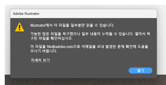 Illustrator 30.2 버전 및 30.2.1 버전에서 작업 후, 일반 저장 및 CS6 버전으로 내보내기 등, 해당 작업으로 진행시 생성된 파일을 타 PC에서 실행 시 위와 같은 오류 팝업 및 아래와 같은 문구가 노출되며 열리지 않는 현상이 있습니다.