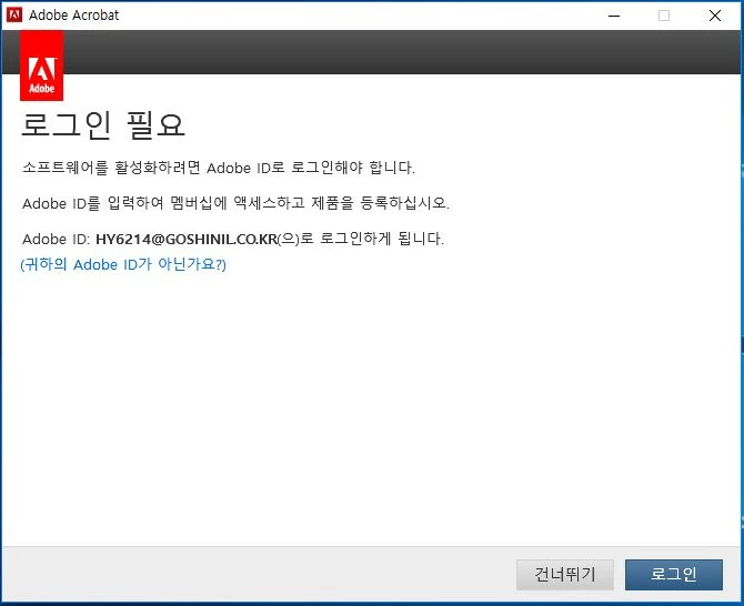 설치된 Acrobat 2017을 실행 후,, 아래 와 같은 로그인 창에서 로그인을 하면 로그인이 되지 않고 계속하여 로그인 화면이 반복적으로 보이고 있어 사용을 못하고 있습니다.