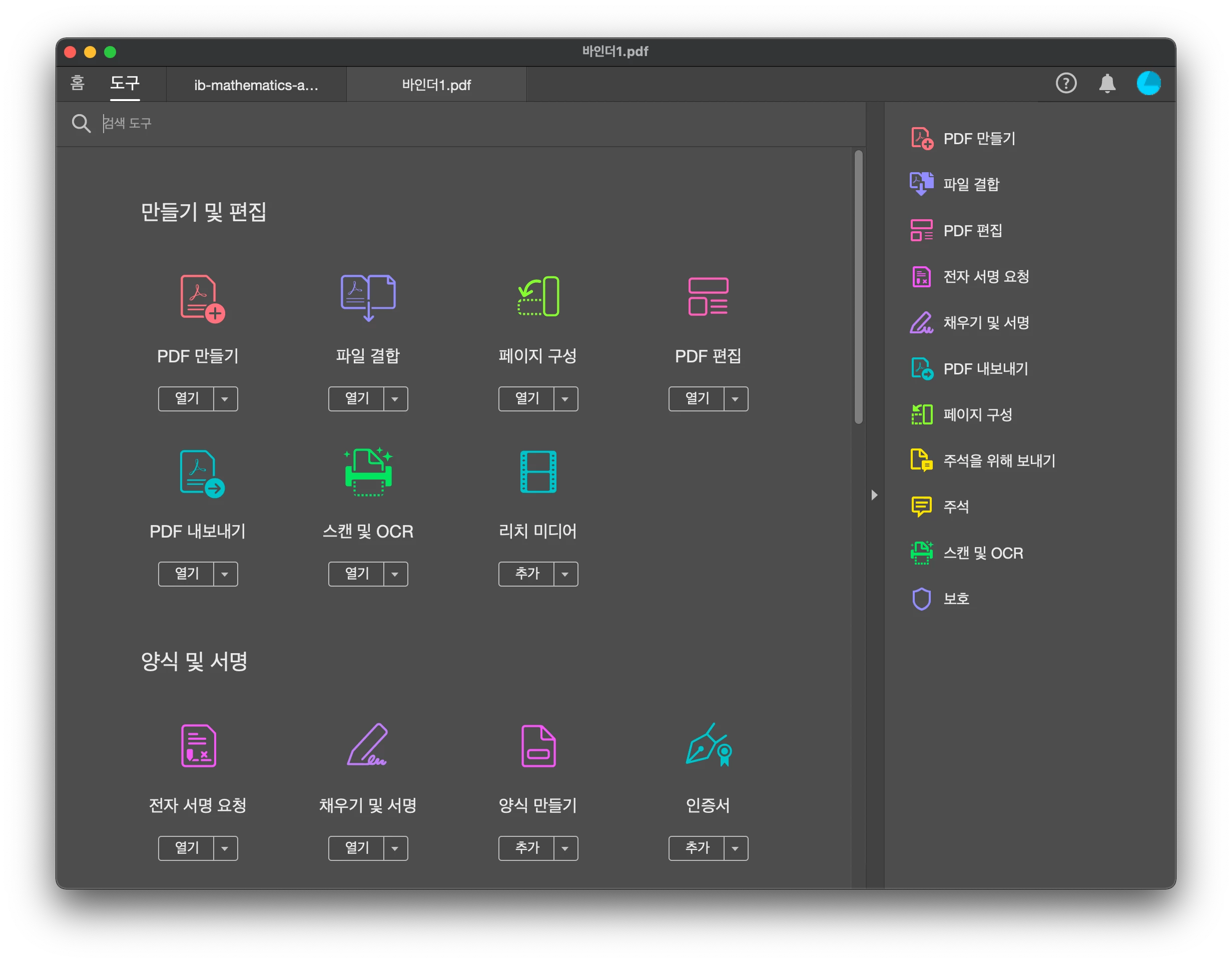 도구를 클릭하시면 위와같은 창이 나옵니다. 여기서 pdf를 생성, 결합, 편집 등등의 작업이 가능합니다.