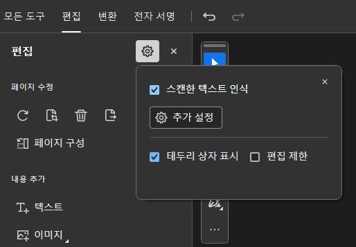 이후에도 안된다면 일단 상단의 이미지에 보이는 새 아크로벳 비활성화를 진행후에도 한번 불러와서 테스트 해볼수 있으며, 이후에 다시 새아크로벳을 활성화 하고 싶다면 상단의 '보기'를 눌러서 새아크로벳 활성화를 해주시면 되시고, 한번 편집 탭에서 설정을 열어서 스캔할 텍스트 인식을 체크를 풀어 보시겠어요?