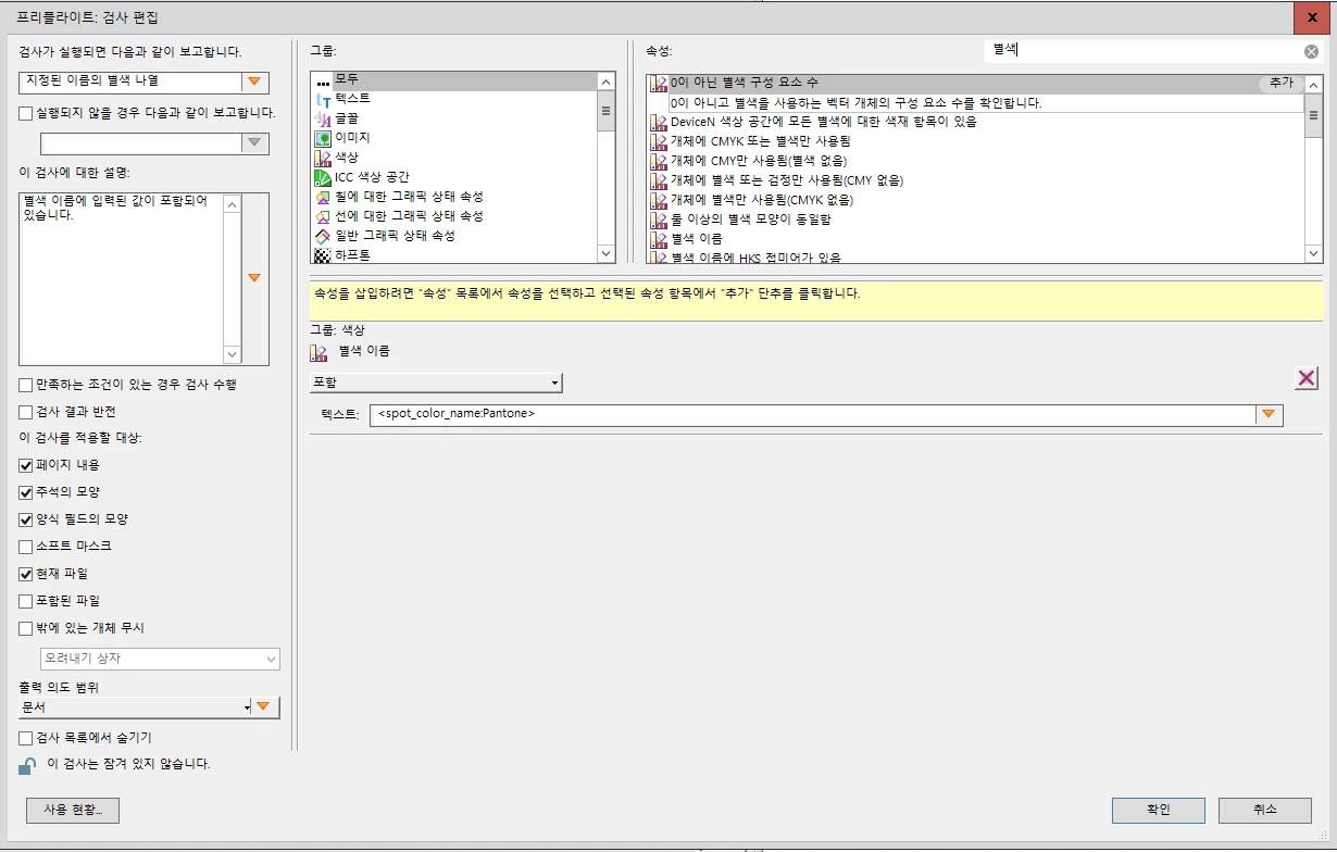 '인쇄물 제작 - 프리플라이트 - 지정된 이름의 별색을 사용하는 모든 개체 제거'