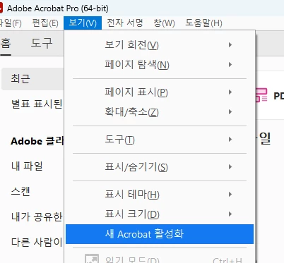 해당 메뉴에서 " 새 Acrobat 비활성화"를 선택 후 재실행하면, 예전 버전의 UI로 변경 됩니다.