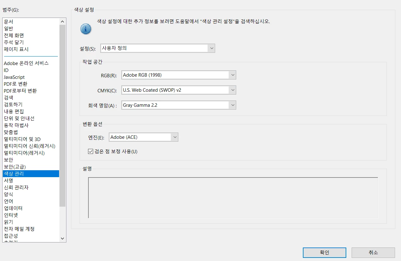 아크로뱃 컬러 셋팅은 위 이미지와 같습니다. 아크로뱃 설정에서 수정된 부분은 없었습니다.