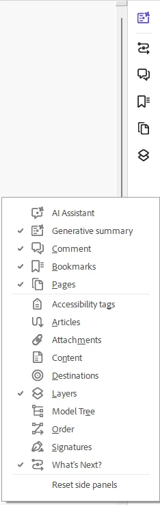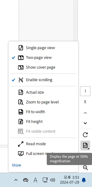 PDF 문서 열었을 때, 오른쪽 사이드 패널에 두쪽보기, 맨 앞으로 가기 등과 같은 기능을 고정하고 싶은데 어떻게 해야 고정할 수 있을까요?