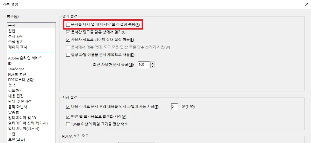PDF 문서를 열었을 때 처음 보이는 레이아웃을 페이지와 책갈피 패널이 보이도록 설정하고 싶어서