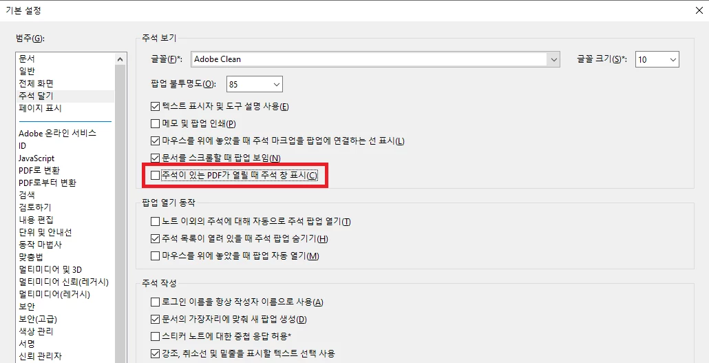 메뉴 > 기본 설정 > 주석 달기 > [주석이 있는 PDF가 열릴 때 주석 창 표시] 체크 해제