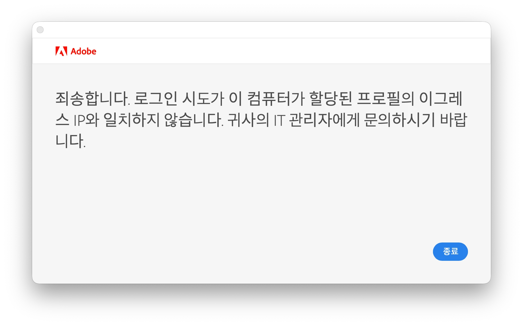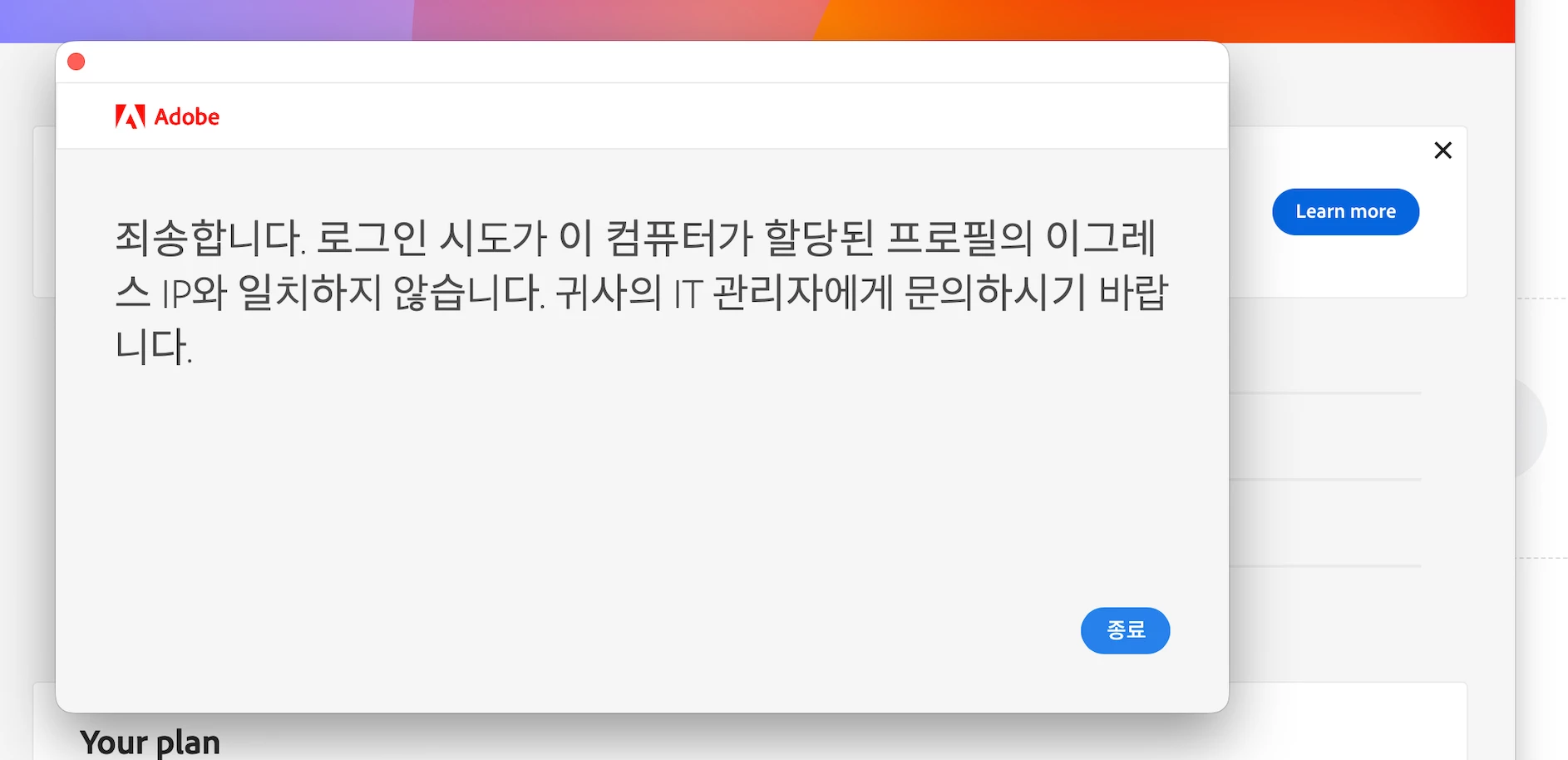 학교 와이파이 외부에서도 사용하기 위해 동일 계정으로 유료 플랜을 결제했지만, 결제 직후 약 한 달간 어도비 제품이 학교 와이파이가 아닌 외부 네트워크에서는 아예 실행되지 않는 문제가 지속되었습니다.