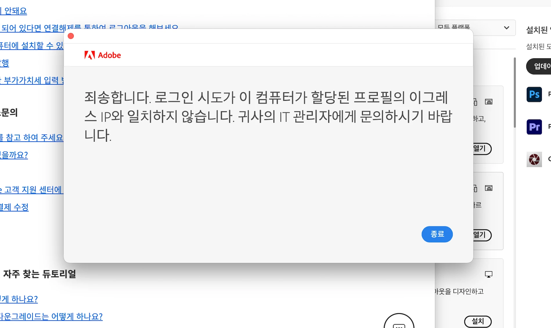 ① 프로그램 재설치: 어도비 프로그램을 모두 삭제한 후 다시 다운로드하여 설치해 보았으나, 외부 네트워크 접속 문제는 해결되지 않았습니다.