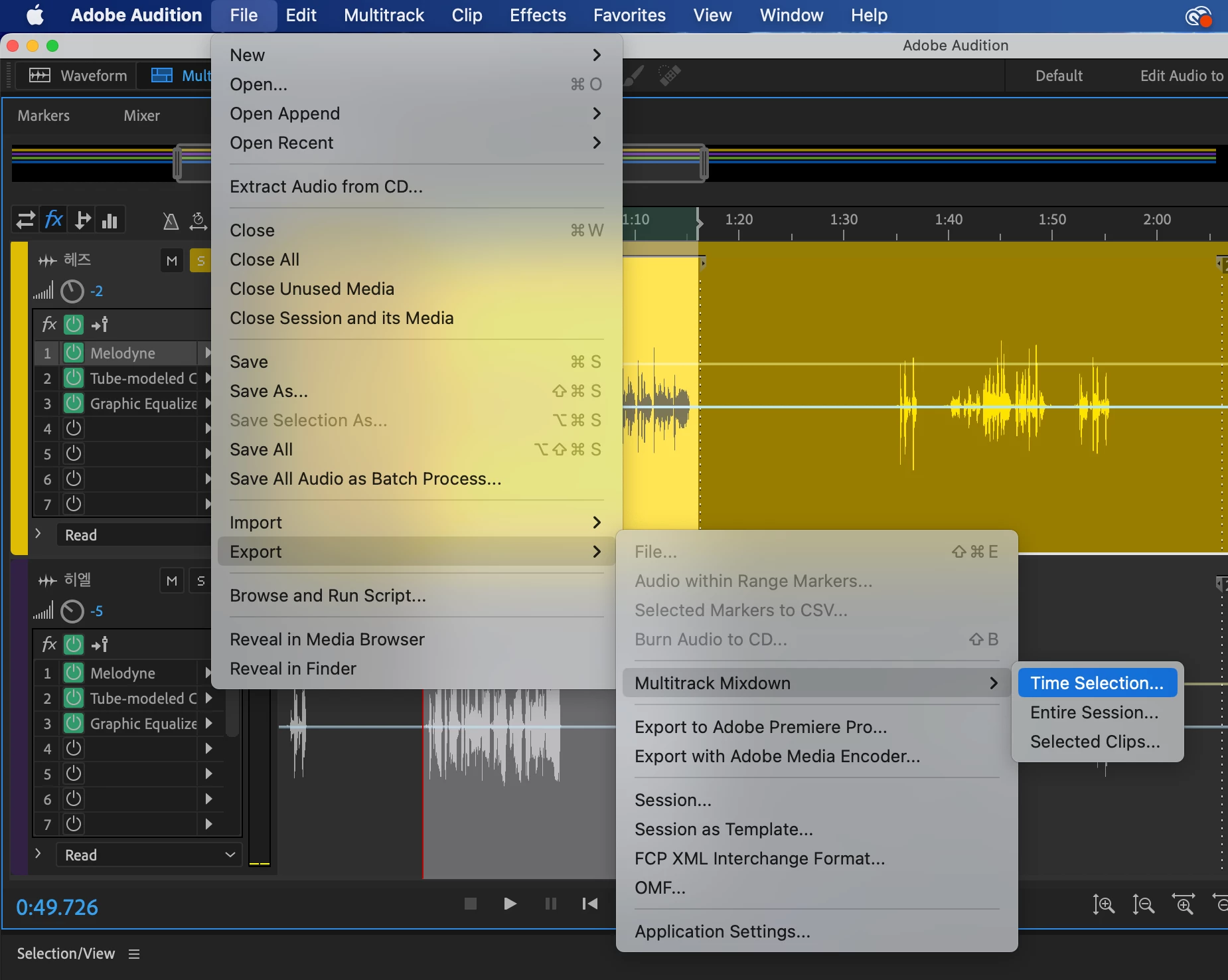 file - export(내보내기) - multitrack mixdown 으로 합쳤는데 적용이 안된 생녹음본만 재생되네요..ㅠ
