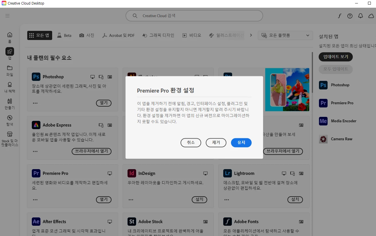 그전에 Media Encoder 를 삭제한 후로 환경 설정이 계속 떠서, Creative Cloud를 삭제 후 재설치 한 상태입니다.