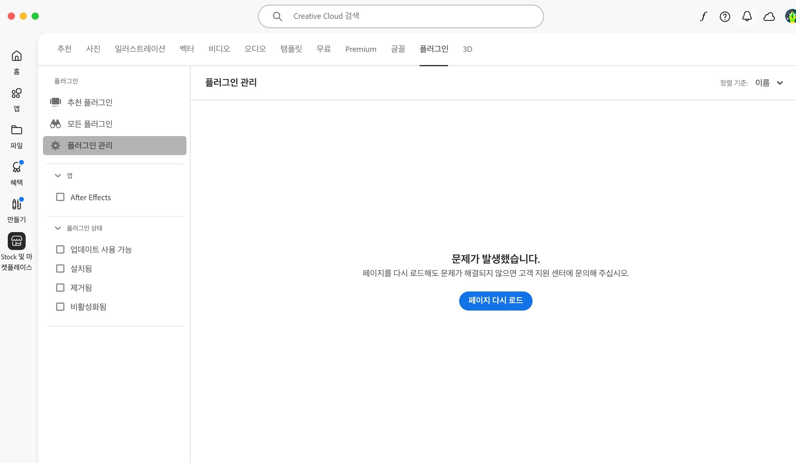 어도비 클라우드 > 플러그인 관리에 문제가 발생했습니다 뜨는 것도 같은 이유일까요? 사진 참고 부탁드릷니다.