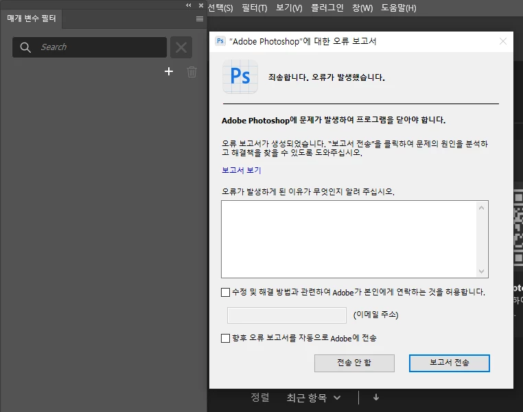 다른 기능은 잘 작동하는 것 같은데 필터-매개변수필터 만 누르면 바로 오류창 뜨면서 포토샵이 꺼집니다.
