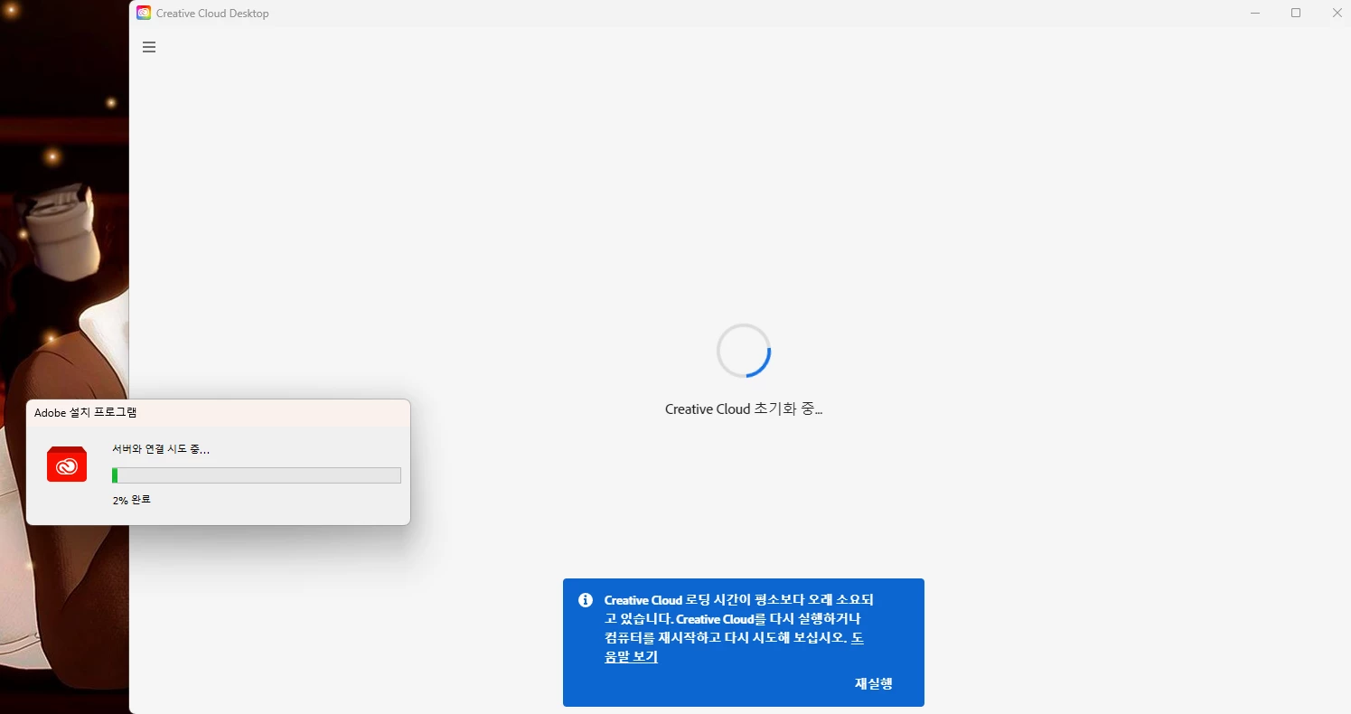 PC재부팅, 어도비 전체 초기화 후 재설치를 수 차례 반복해도 절대로 되지 않네요.