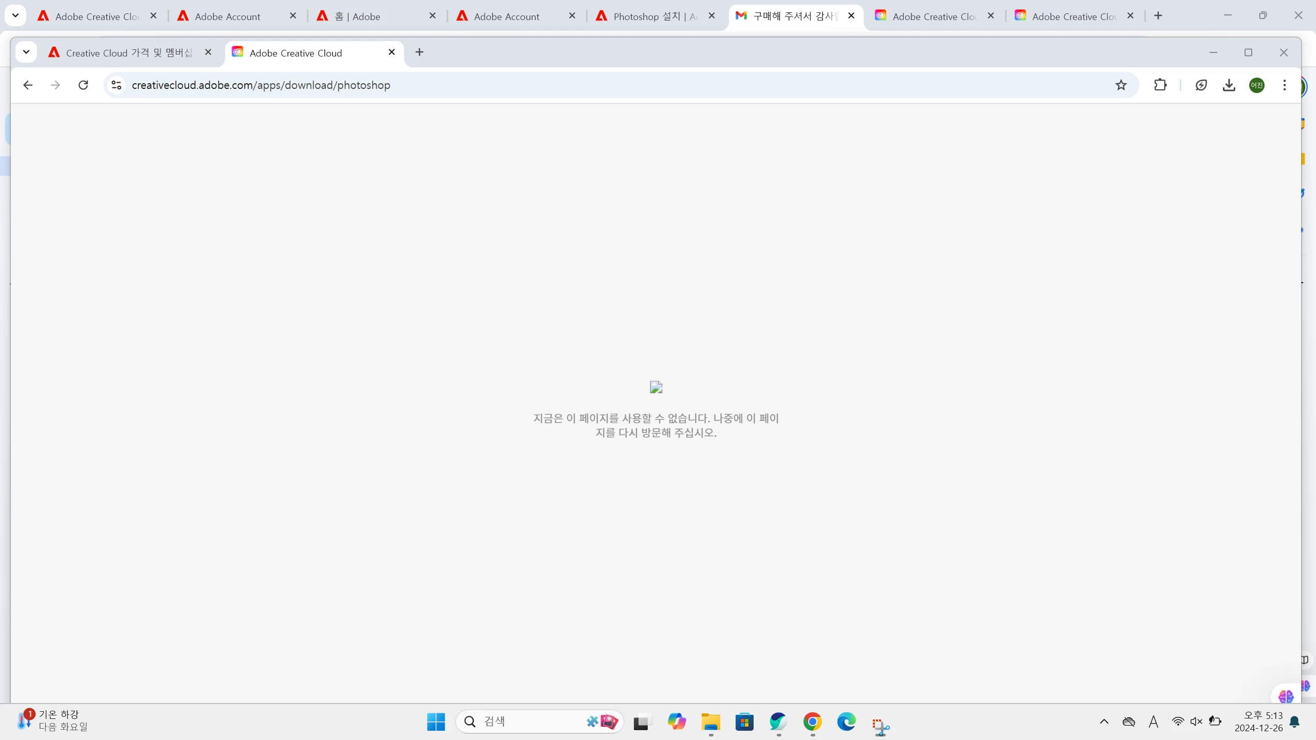 어도비 홈페이지에 들어가 다운로드를 눌러도 아무일도 안일어나고 설치파일이 뜨지도 않습니다. 메일로 보내진 주소로 들어가서 다운로드 누르면 사진처럼 뜹니다. 왜그런 걸까요..? 전에 크랙파일 설치했던 적이 있어서 다 지웠는데 그게 영향이 있는걸까요?