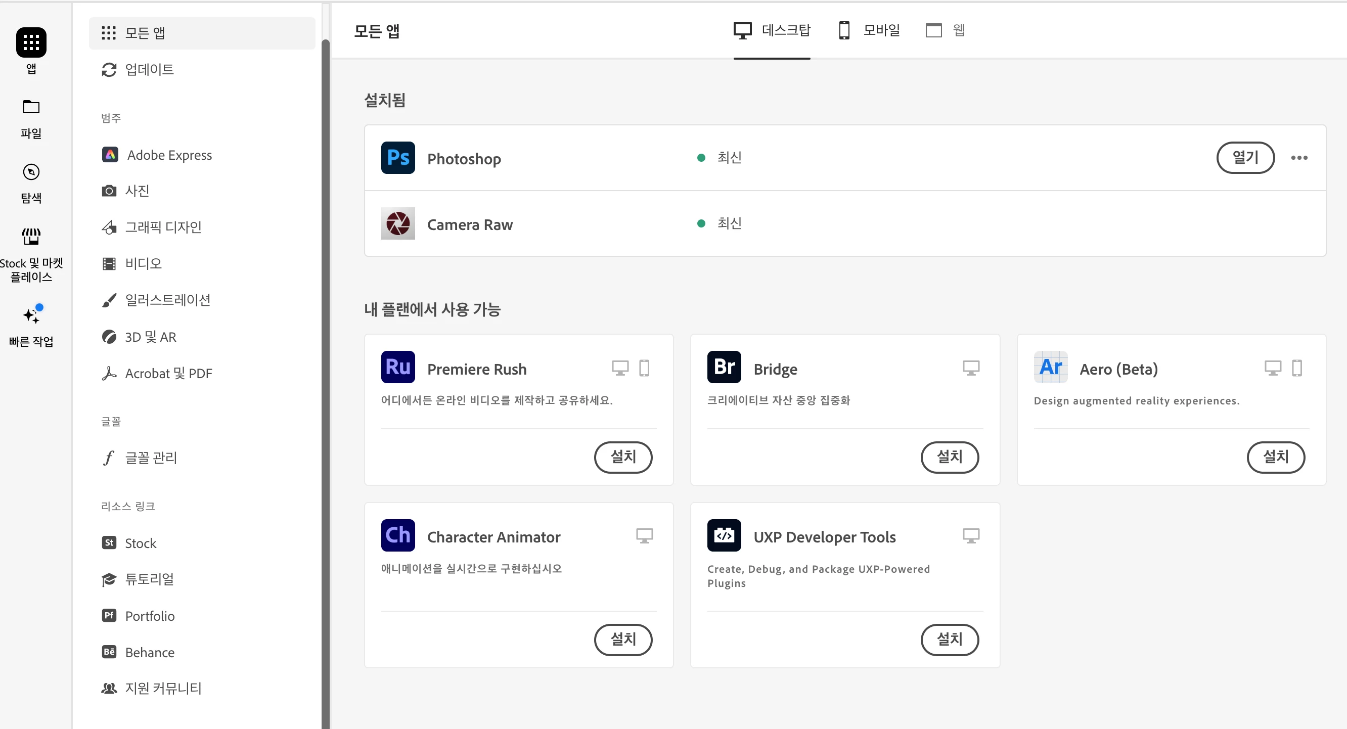 웹에서는 데스크탑에서 사용 가능한 앱들이 뜨는데 Creative Cloud 앱에서 7가지밖에 안 뜹니다. 웹에서 다운받으려고 해도 앱으로 넘어가서 아무것도 뜨지 않습니다. 플랜에서 사용 가능한 나머지 앱은 어떻게 다운로드하는 걸까요?