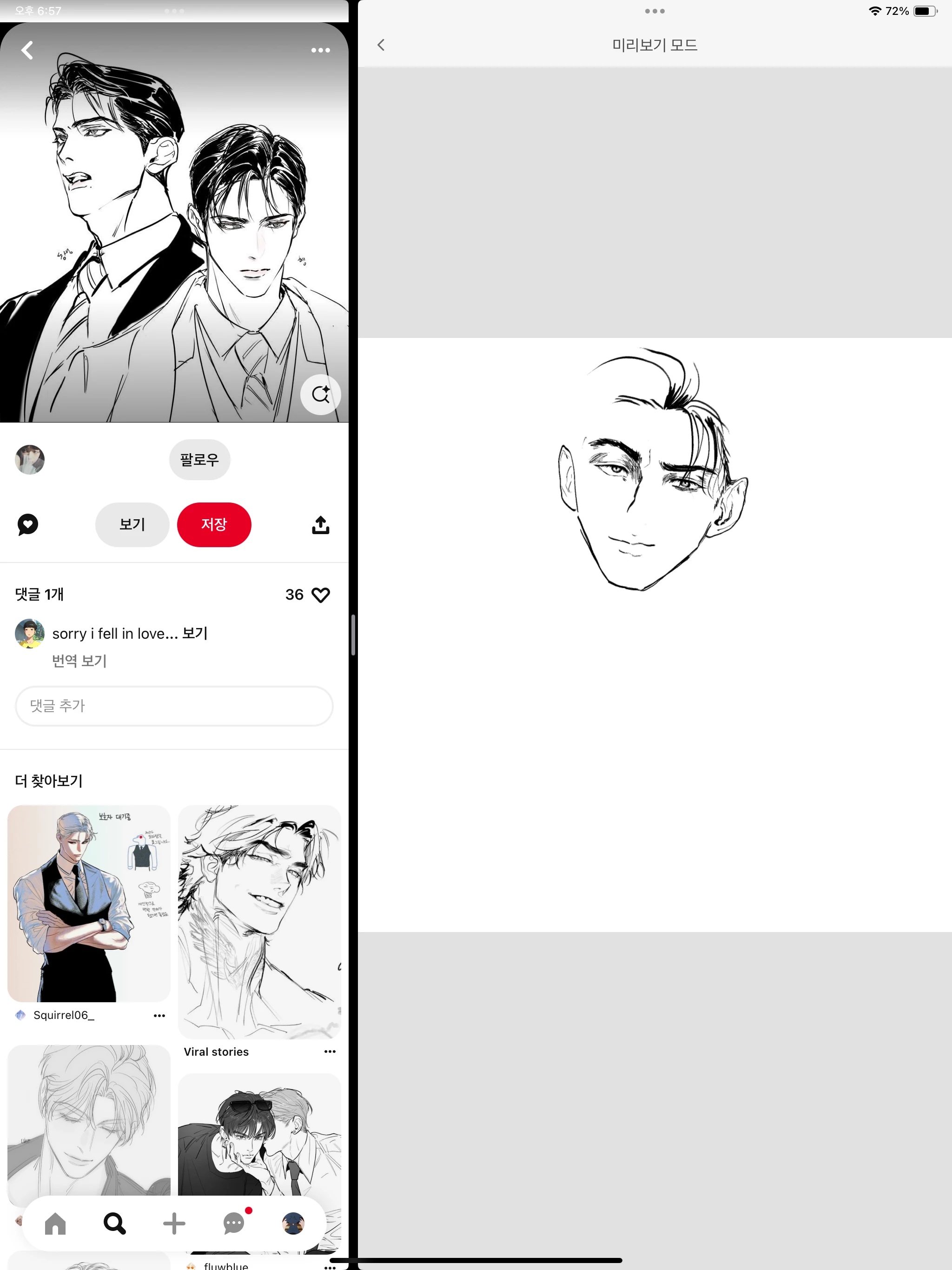 이전엔 분명 Split View로 자료 찾으면서 그림 그렸던 것 같은데 오늘 하니까 프레스코가 Split View를 켜면 미리보기로 전환이 되면서 안 그려지더라구요.