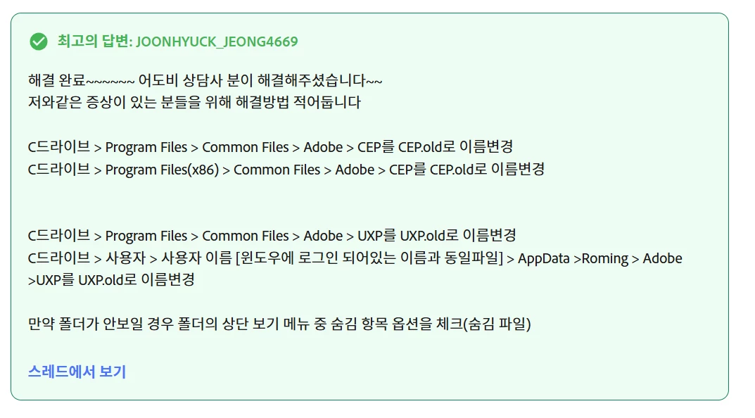 추가로 환경설정 충돌의 문제인지 확인해보기위하여 수동 환경설정 초기화 방법을 안내드립니다.