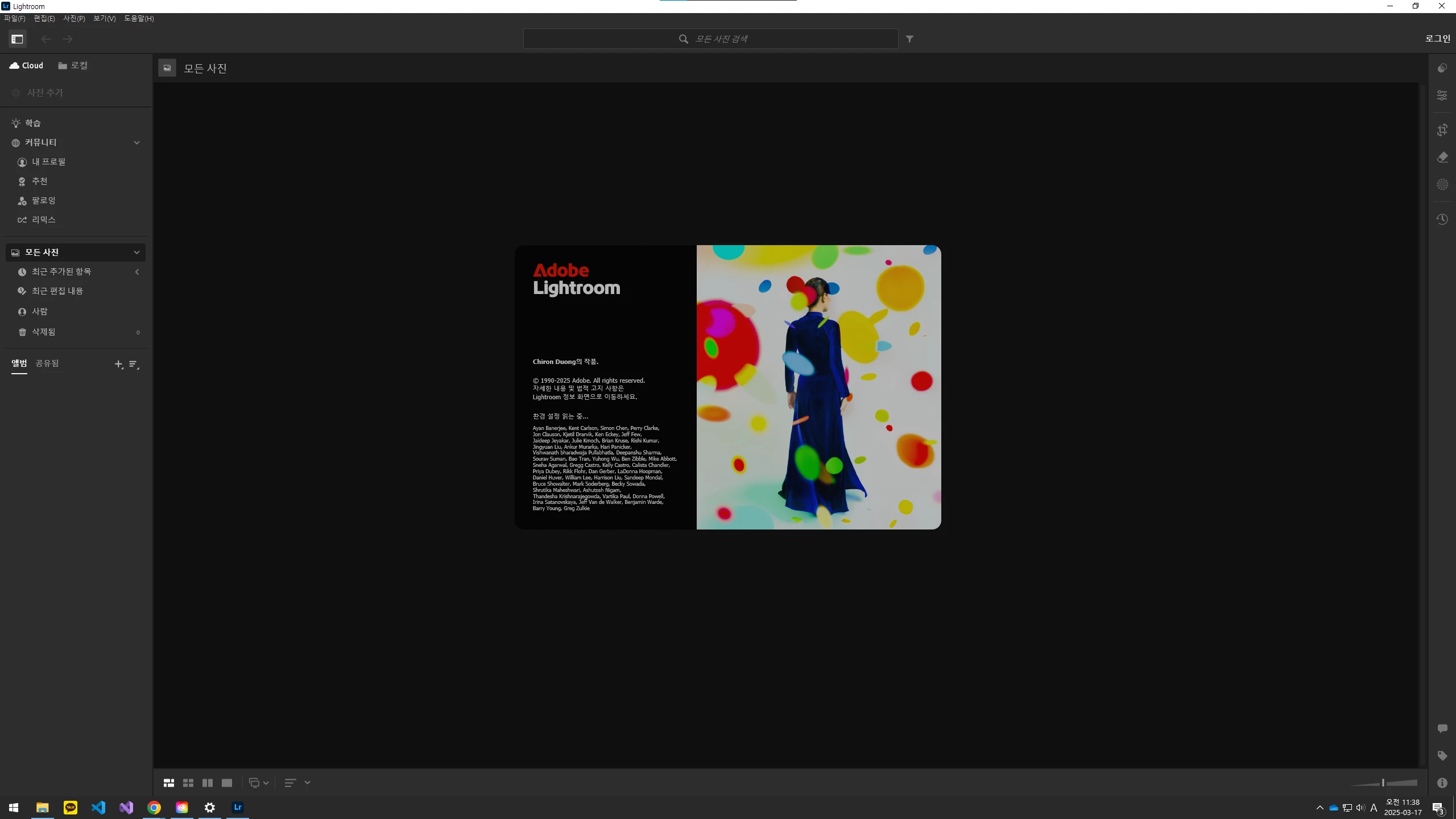 윈도우에서 라이트룸 설치 후 실행 했을 때, 아래 사진과 같이 초기 화면만 잠시 보이고 바로 꺼지는 현상이 있습니다.