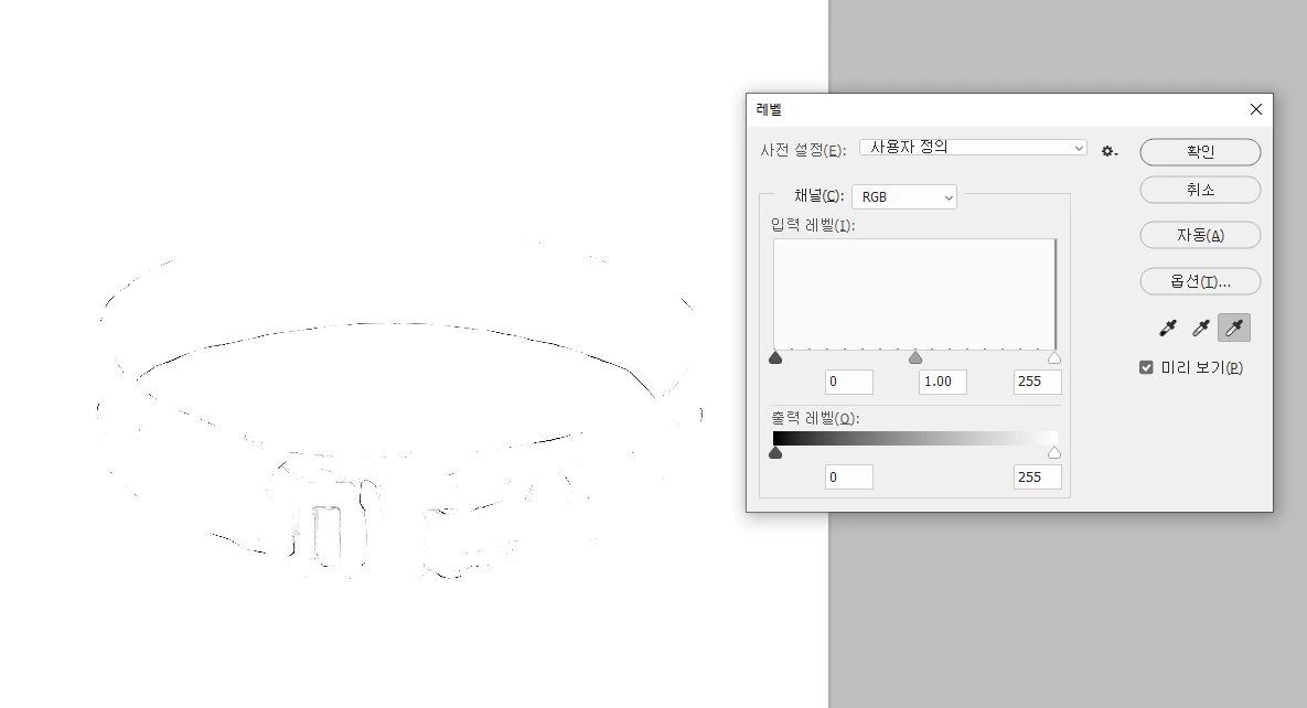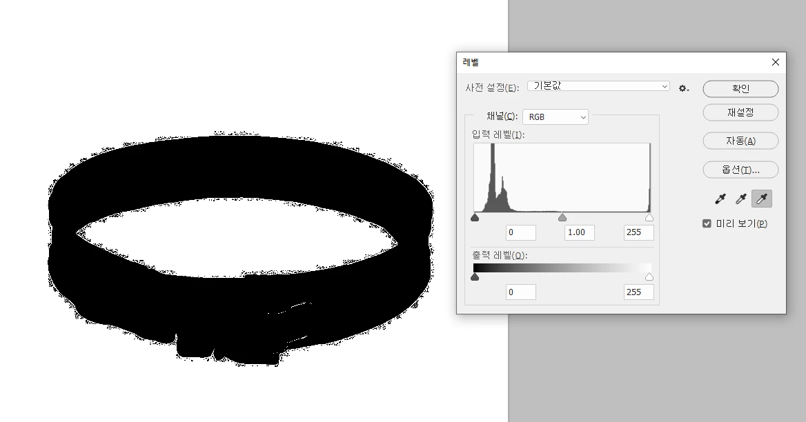 원래 배경이 화이트인 상품 누끼 이미지에서 레벨창 - 흰색 점 스포이드로 피사체 주변 그림자나 그레이톤을 클릭해 주변을 한번에 날릴 때 사용했었는데요, 검은 점 스포이드는 평소처럼 제대로 작동하는데 흰색 점 스포이드로 육안으로 보이지 않는 옅은 그림자 부분 (창 활성화 후 스포이드 누르고 alt 버튼 누르며 확인하면 윤곽이 드러남) 을 확인 후 평소같은 영역을 클릭하면 상품의 형상까지 함께 날아가버립니다.