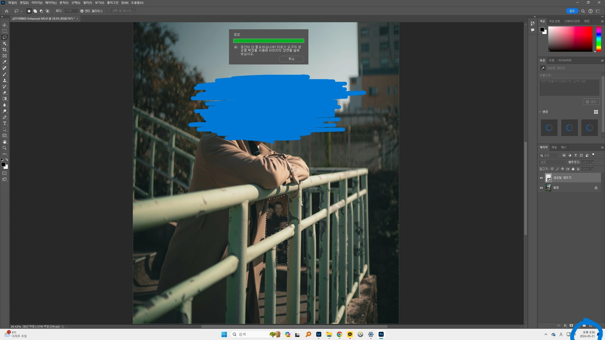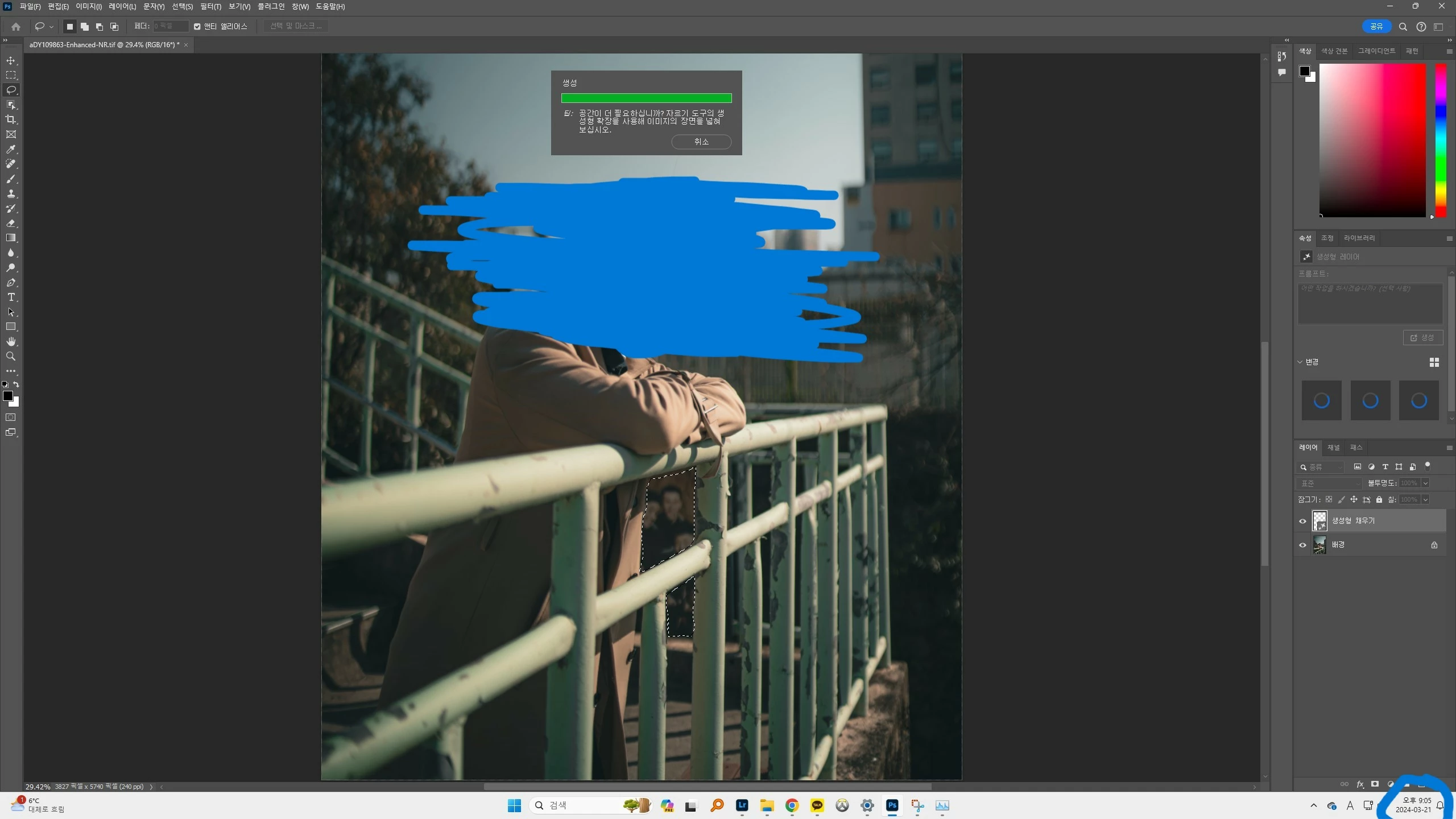 생성형 채우기 기능(generative fill) 실행 시 첨부사진과 같이 로딩이 다 되어도 다음 단계로 넘어가지 않고 멈춰있습니다.(프로그램이나 컴퓨터 자체 렉이 걸린 것이 아닙니다. 취소 버튼 누를 시 바로 동작 취소됩니다.) 10분정도 기다리면 해당 기능이 실행되거나 서비스가 응답하지 않는다는 오류가 뜹니다. 포토샵을 지웠다 깔아봤고 구버전으로 해도 똑같습니다... 해결방법 아시는 분 계실까요?