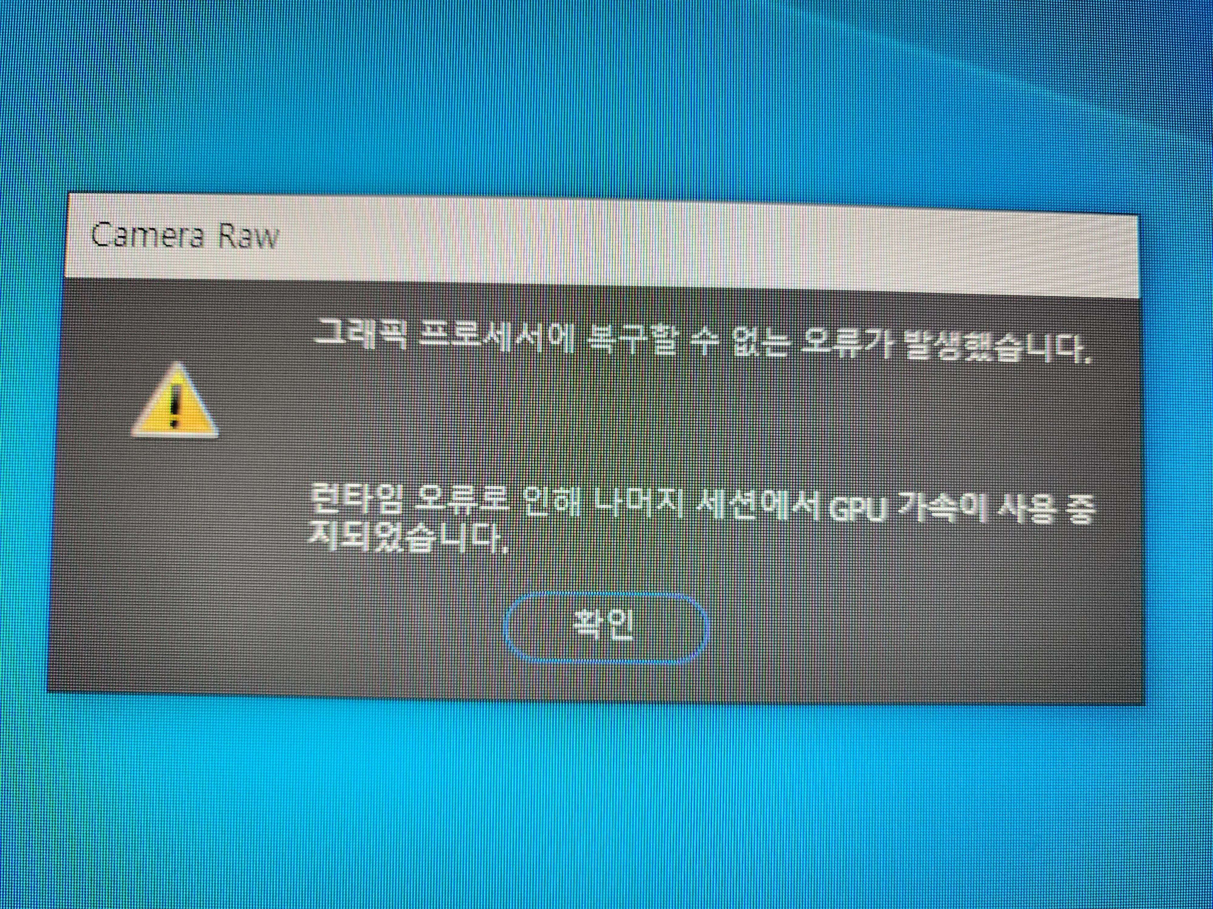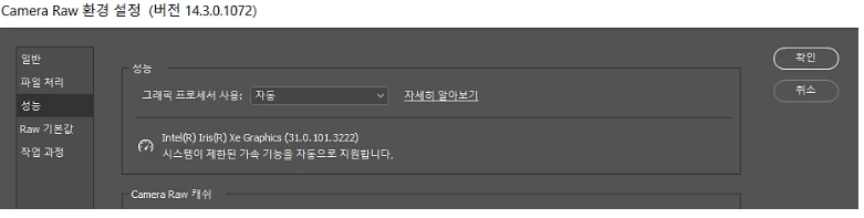 > 만약Camer Raw 선택시 오류창 발생 혹은 그래픽 프로세서 사용부분이 비활성화 되어있다면,