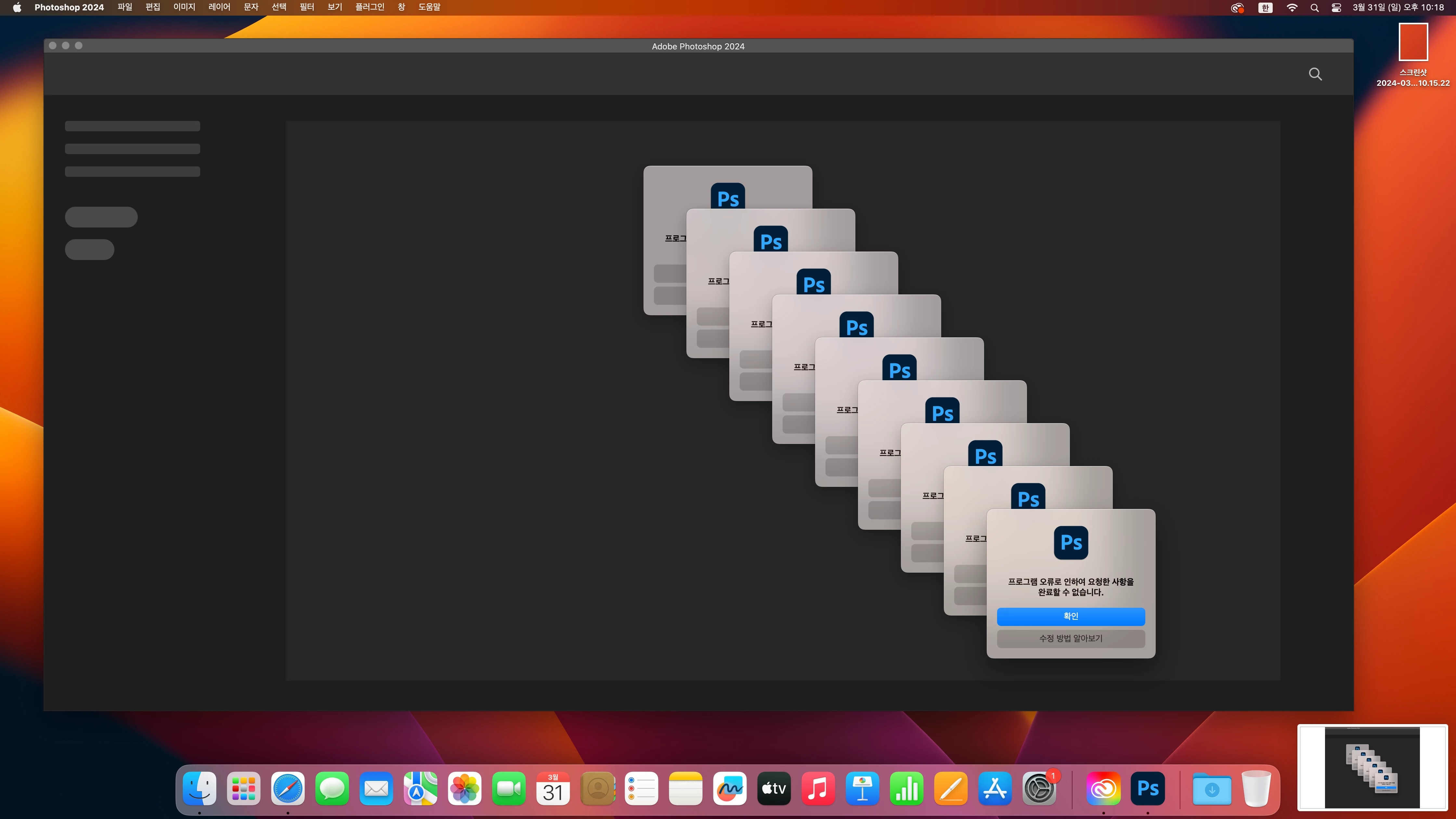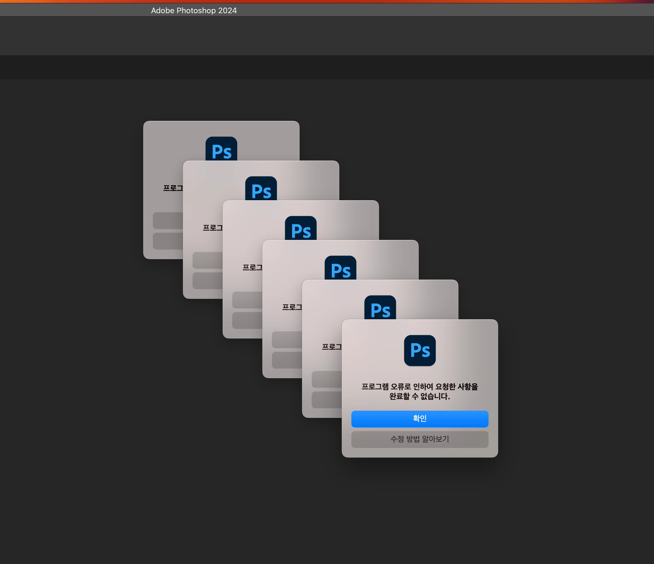 m1 포토샵 실행하자마자 프로그램 오류로 인하여 요청한 사항을 완료할 수 없습니다.