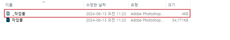 공유받는사람이 파일이 하나씩 더있다고해서 확인해보니 예를들어 10개의 PSD 가 있으면 동일 명이지만 용량이 4 키로바이트 정도 되는 파일이 하나씩 더 생성되어있습니다.