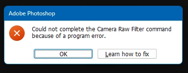 리퀴파이(픽셀유동화), 카메라로우 필터 실행 시 에러 팝업이 뜨는 현상이 지속됩니다.