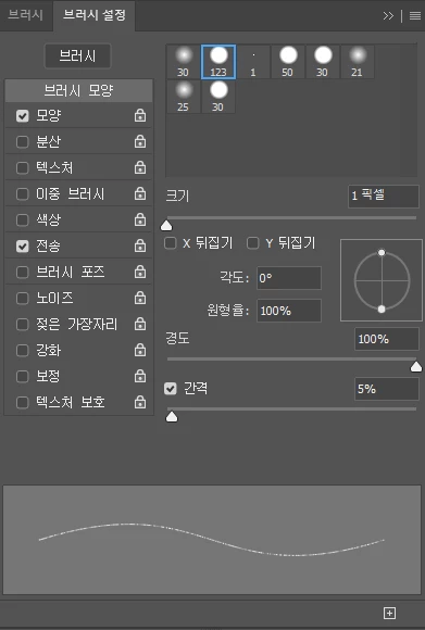 사진으로 보시는바와 같이 브러시 도구의 크기를 10이하로 작게 설정하면 간격이 생겨납니다.