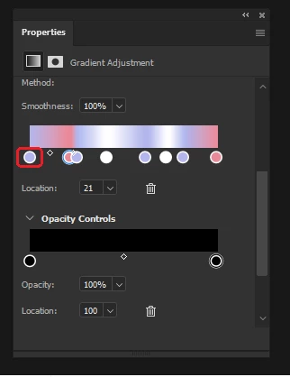 그라디언트 선택 > 속성 패널을 열고 색상 원 클릭 > Alt 누른 상태로 원하는 컬러의 위치를 클릭하면,