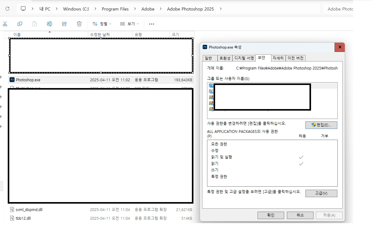 2.포토샵의 exe 파일에 사용 권한 부여 혹은 관리자 권한으로 실행해보기