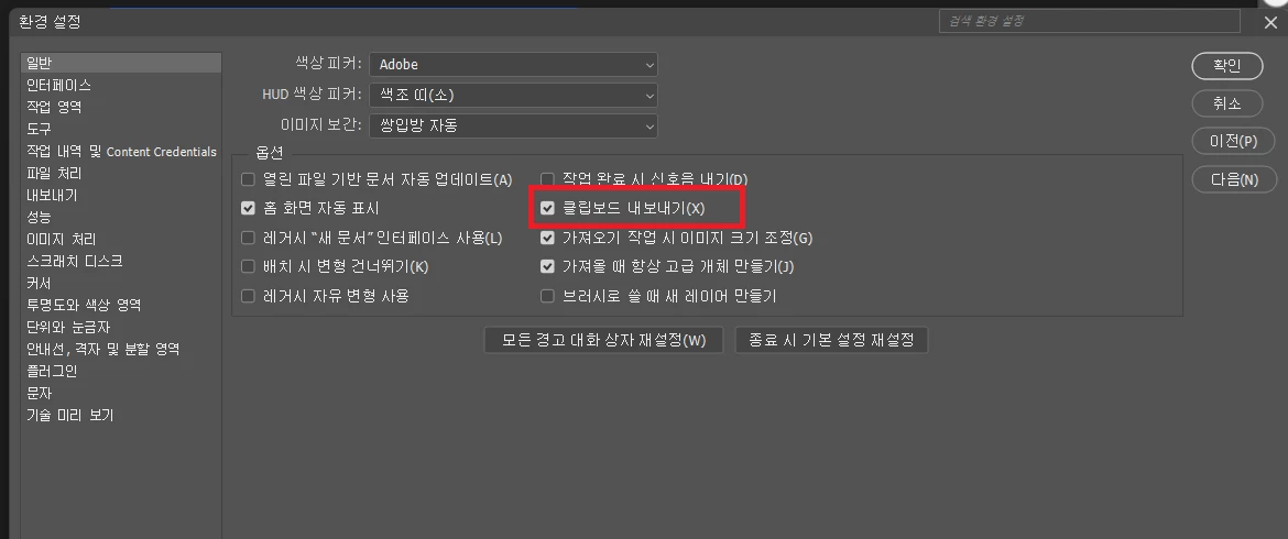 클립보드 내보내기라는 부분이 체크 되어있는지 확인 (풀려있다면 체크하시고 다시 포토샵을 재 실행 해주세요!)