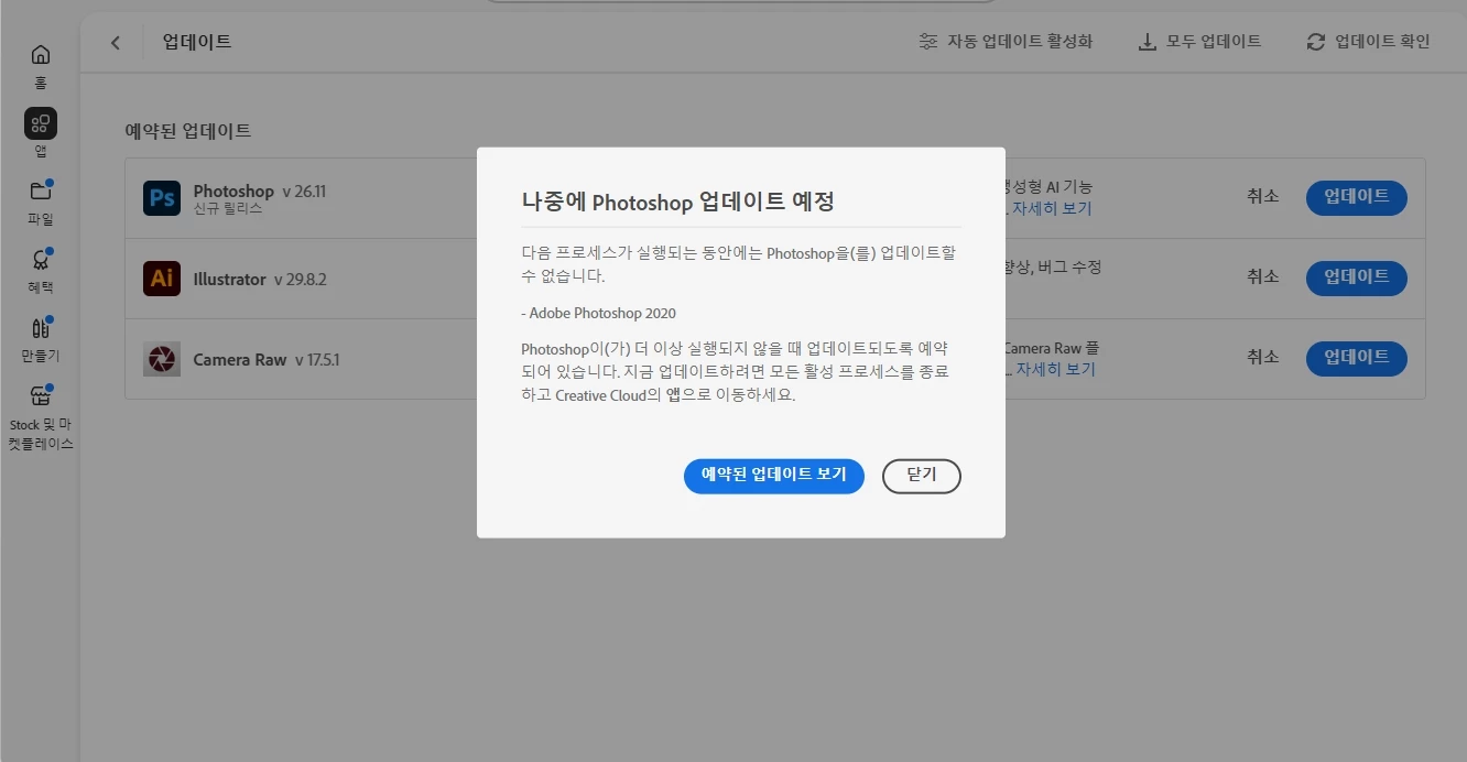 Adobe Photoshop 프로세스가 실행되어 업데이트를 시도할 수 없다고 노출되는 내용은