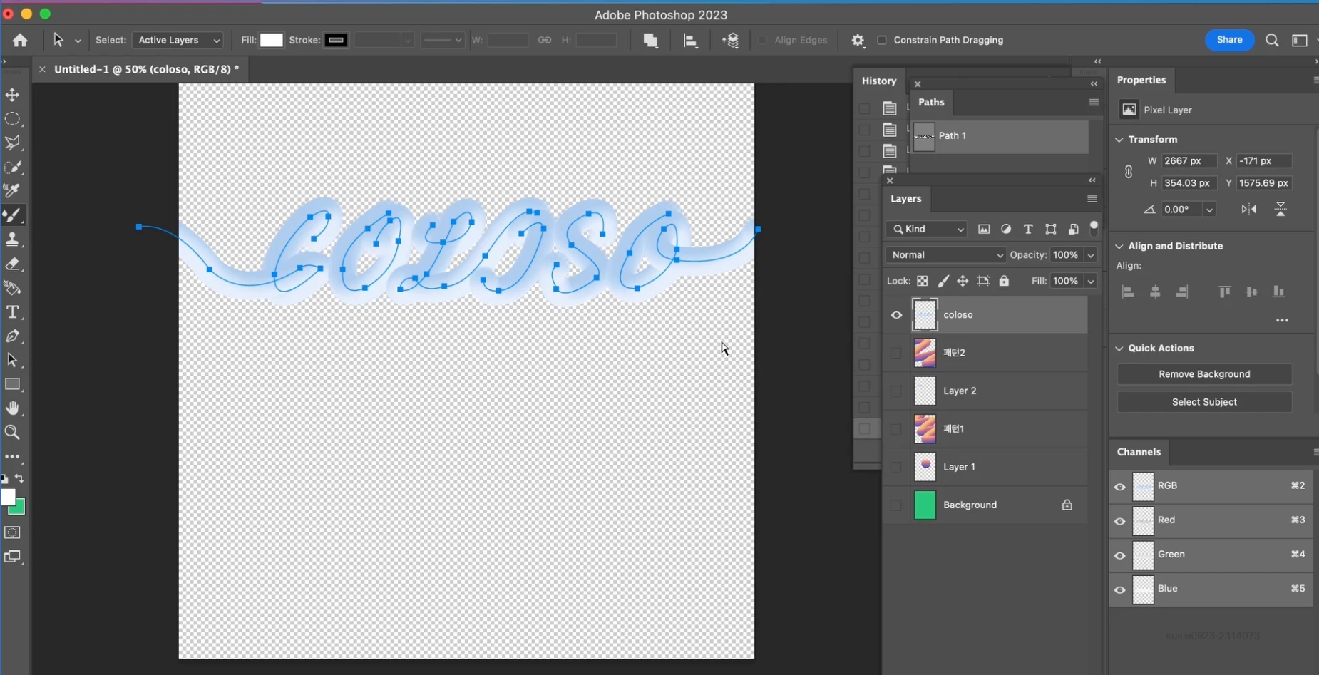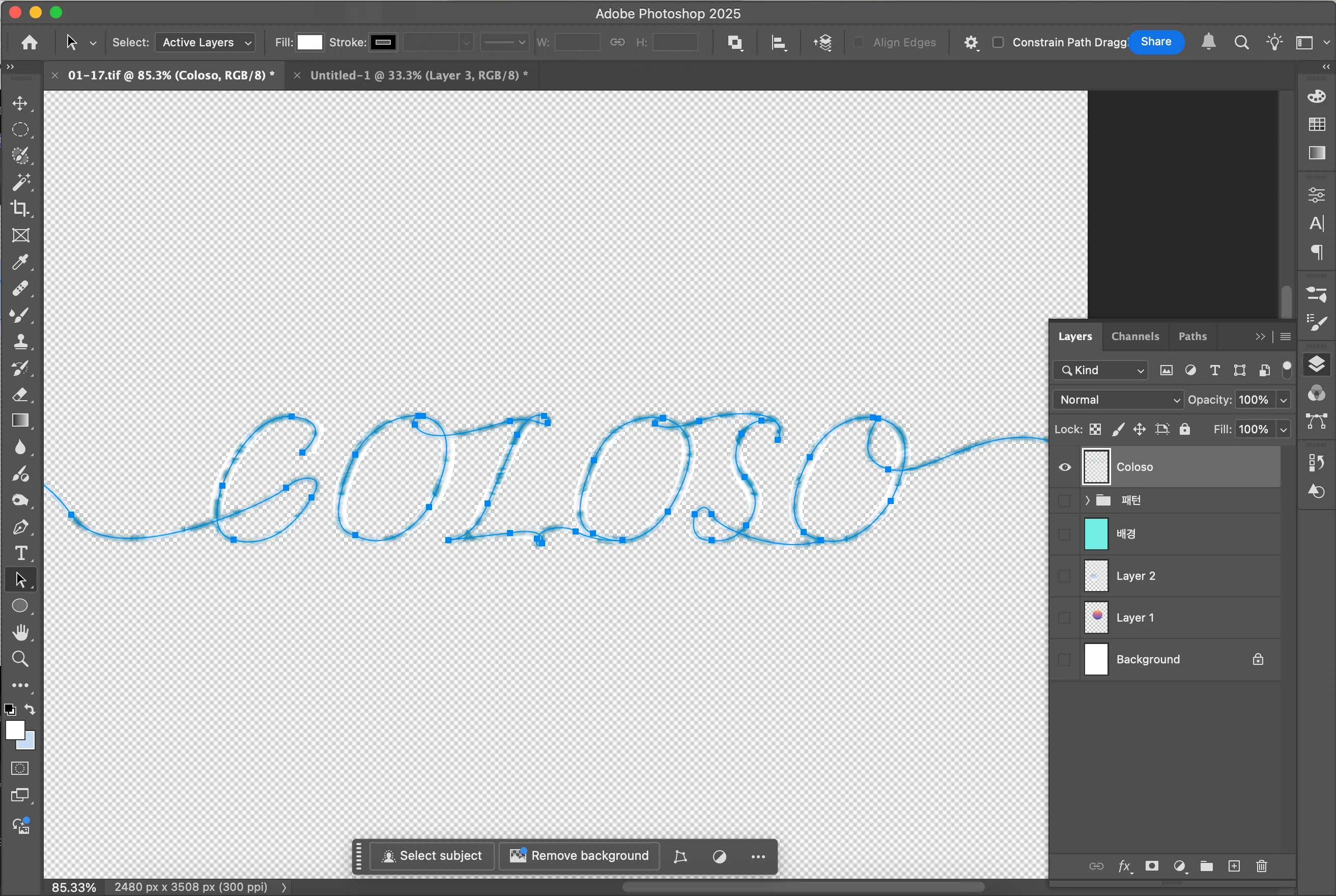 타이포와 펜툴 Path 선택 후 Path Selection Tool로 Stroke Path > Mixer Brush Tool 선택하여 적용하면 영상에서는 입체 타이포효과가 적용되지만 제 맥북에서는 해당 기능이 이상하게 적용됩니다.