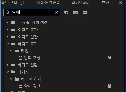 유튜브 보면서 영상 공부하고 있는데 효과 탭에 알파 경사 검색했는데 안 뜹니다. 다른 탭에서 사용해야하는 건지 궁금합니다.