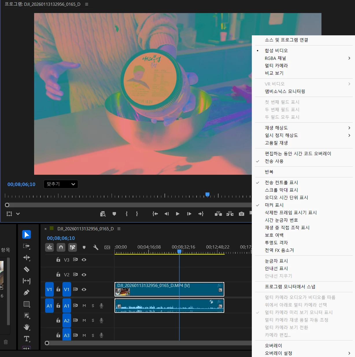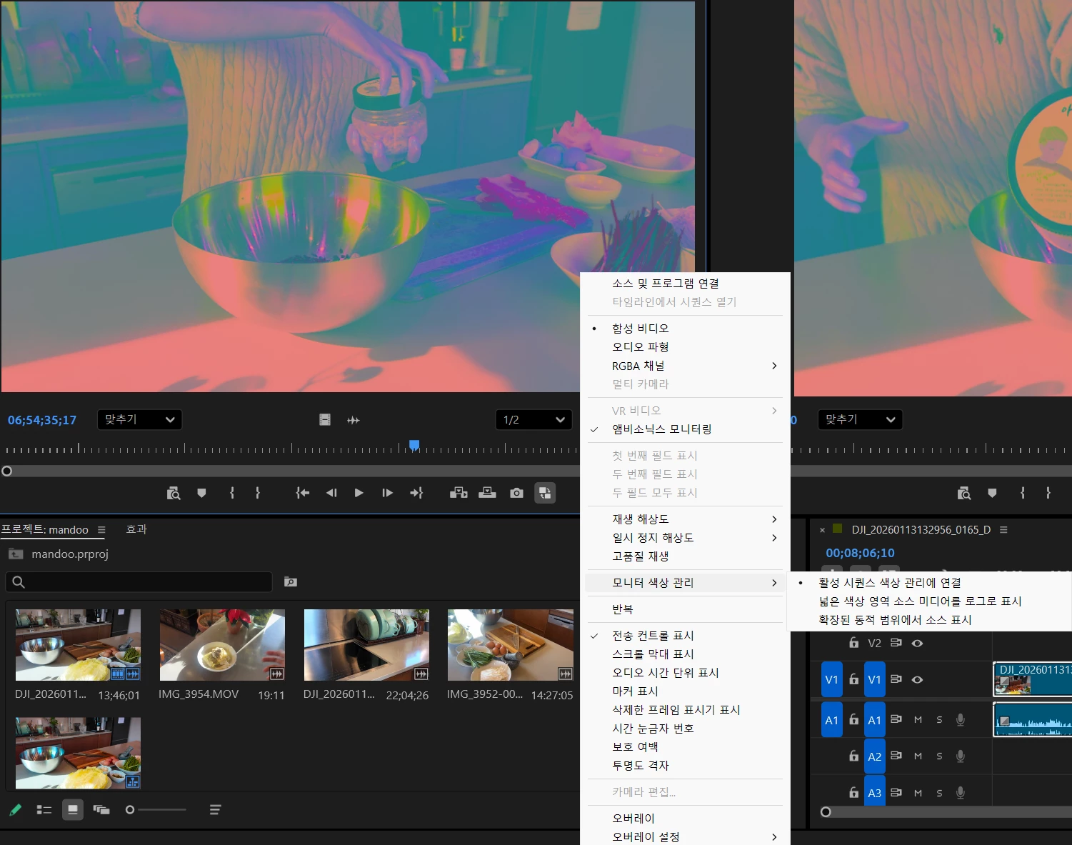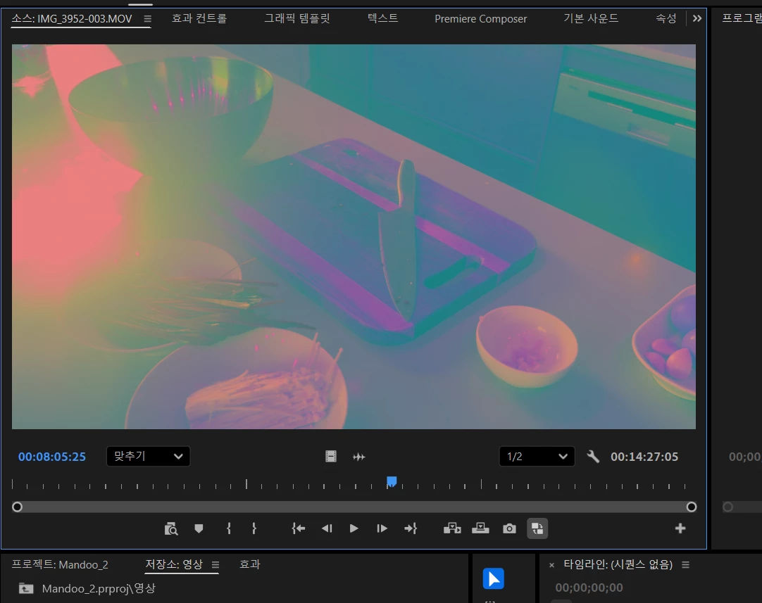 영상/이미지가 소스 모니터 / 프로그램 모니터에서만 전체적으로 핑크·청록(마치 False Color/컬러맵처럼) 이상하게 표시됩니다.